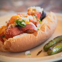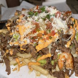 I need to try more on the menu but we always get the surf n turf fries here because just look at them. The shrimp is great, meat tender and they got all the right toppings. We usually eat there on their cute outdoor patio, and their house salsas on the table are so good on top! Staff is nice and quick as well. The bar area is usually pretty quick with drinks too and the micheladas are huge with a perfect rim!
